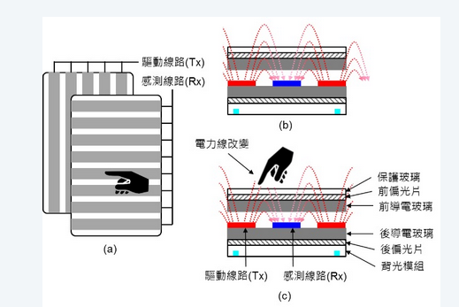 觸摸線路(Sensorpattern)的驅(qū)動線路(Tx)與感測線路(Rx)到底要做在那里比較好呢?每一家公司各有自己的技術(shù)與專利,基本上各有優(yōu)缺點,并沒有決對的好壞,簡單從圖一(c)的液晶面板構(gòu)造可以看出,能夠制作觸摸線路的地方不外乎前導(dǎo)電玻璃的上方或下方、后導(dǎo)電玻璃的上方三個位置。