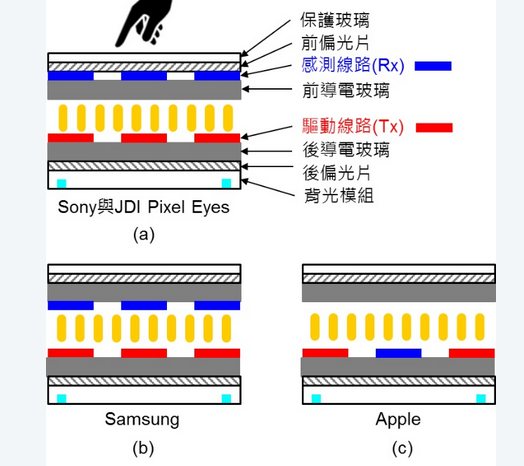 一般而言,驅(qū)動線路(Tx)都在后導(dǎo)電玻璃的上方,這樣電力線才會由下向上投射出來,而感測線路(Rx)每一家公司設(shè)計的位置則不相同,Sony與JDI的“PixelEyes”把Rx制作在前導(dǎo)電玻璃的上方,如圖二(a)所示;Samsung把Rx制作在前導(dǎo)電玻璃的下方,如圖二(b)所示;Apple把Rx制作在后導(dǎo)電玻璃的上方,也就是與Tx制作在同一個地方,因此制程最復(fù)雜成本[敏感詞],如圖二(c)所示。