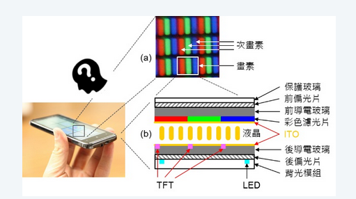 手機由于體積小又由電池供電,因此顯示器必須符合輕薄省電的要求,目前主要是使用“液晶顯示器(LiquidCrystalDisplay,LCD)”。LCD的構(gòu)造如圖四所示,由下而上順著光前進的路徑依序有背光模組(Backlight)、后偏光片(Polarizer)、后導(dǎo)電玻璃、薄膜電晶體(ThinFilmTransistor,TFT)、液晶(Liquidcrystal)、彩色濾光片(Colorfilter)、前導(dǎo)電玻璃、前偏光片(Analyzer)、保護玻璃(Coverglass)等,構(gòu)造與原理有些復(fù)雜,這里我們不詳細介紹(對LCD工作原理有興趣請參考這里)。
