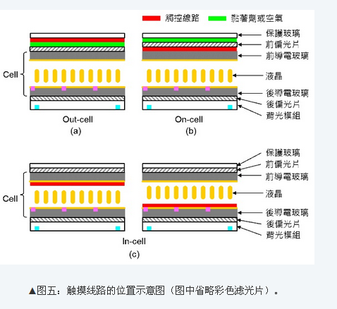 觸摸面板需要“觸摸線路(Sensorpattern)”來確定使用者手指點選的位置,觸摸線路如果先制作在保護玻璃(Coverglass)上再以黏著劑貼合在面板(Cell)的前導(dǎo)電玻璃上方(也就是在Cell外面),則稱為“Out-cell”,如圖五(a)所示。